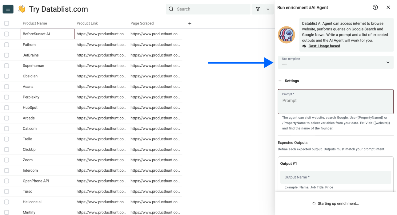 Unlike other "templates" that still require a lot of configuration, the only thing you have to do with Datablist's AI Agent is select the Product Hunt template, paste your URL, and start the process.