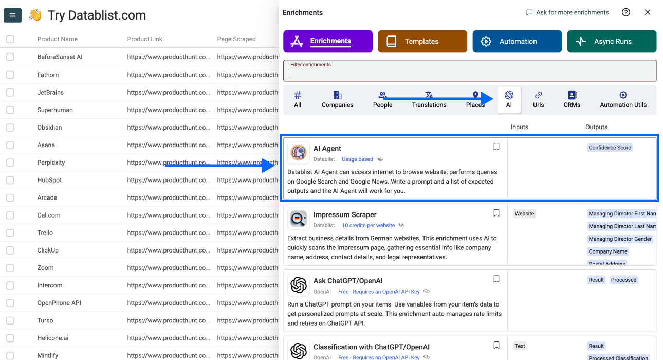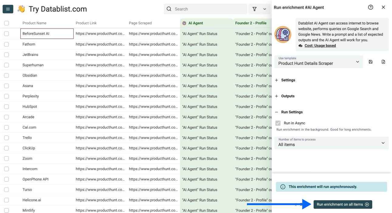 In this phase, we'll use Datablist’s AI Research Agent to get all the product details and founder information available on the Product Hunt product page, including: