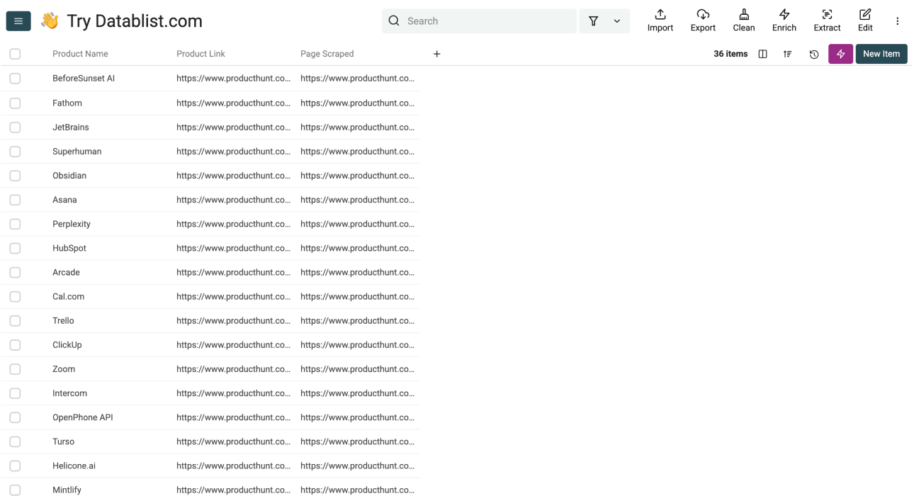 As you can see, scraping Product Hunt with Datablist is pretty simple. The only thing you have to do is use our templates, but remember, this is not a given because many "no-code" tools may work without code, but Datablist is the only one that works without any tech headaches.