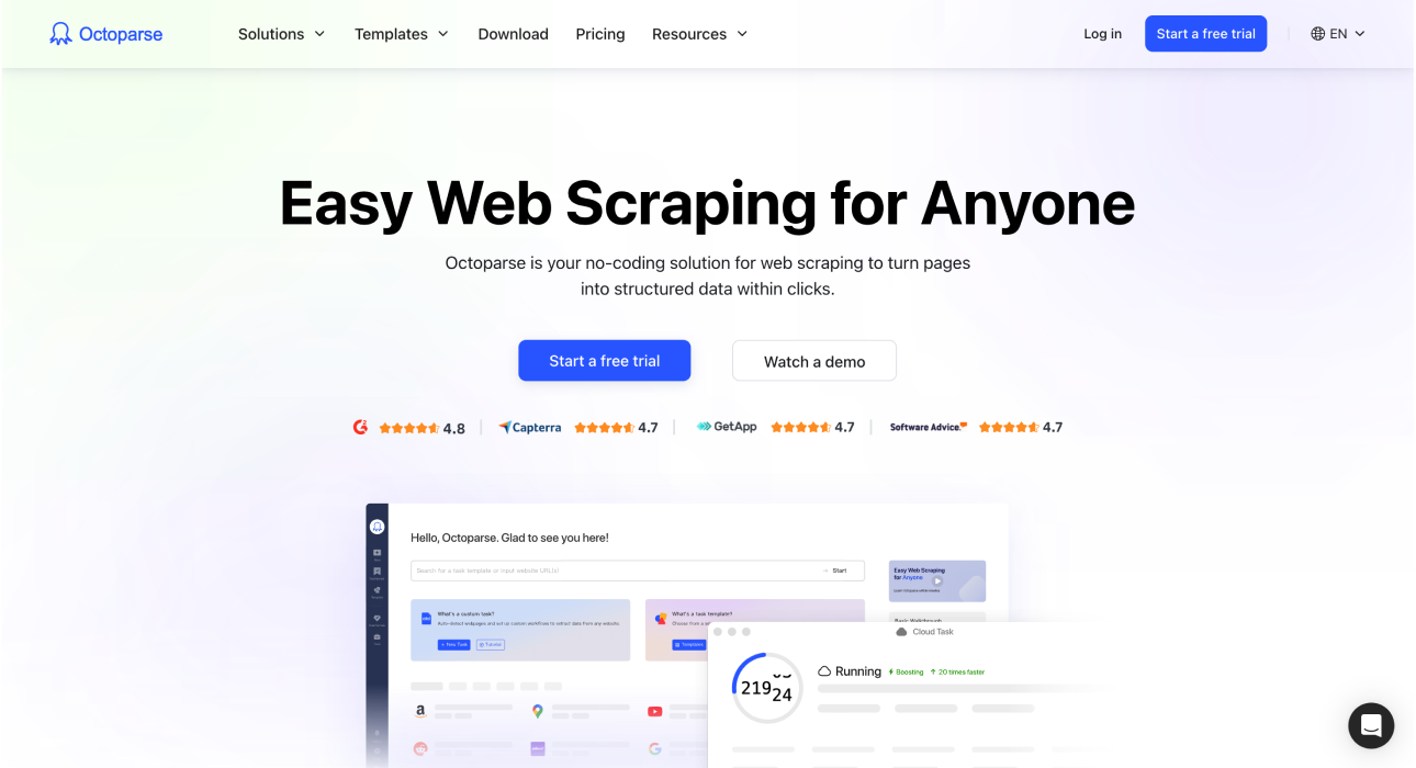 Octoparse is a visual web scraping tool that is genuinely no-code. You don't need to write code or configure an API, which is a big step in the right direction.
