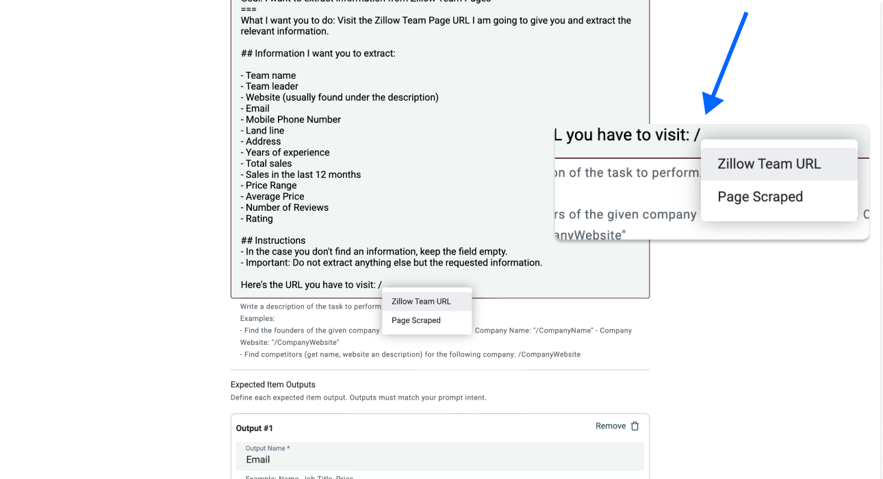 - Now, scroll down to the end of the prompt and insert the Zillow team page URL as Input Property