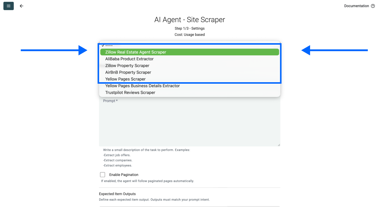 - Click on the Template Drop-Down and select “Zillow Real Estate Agent Scraper”