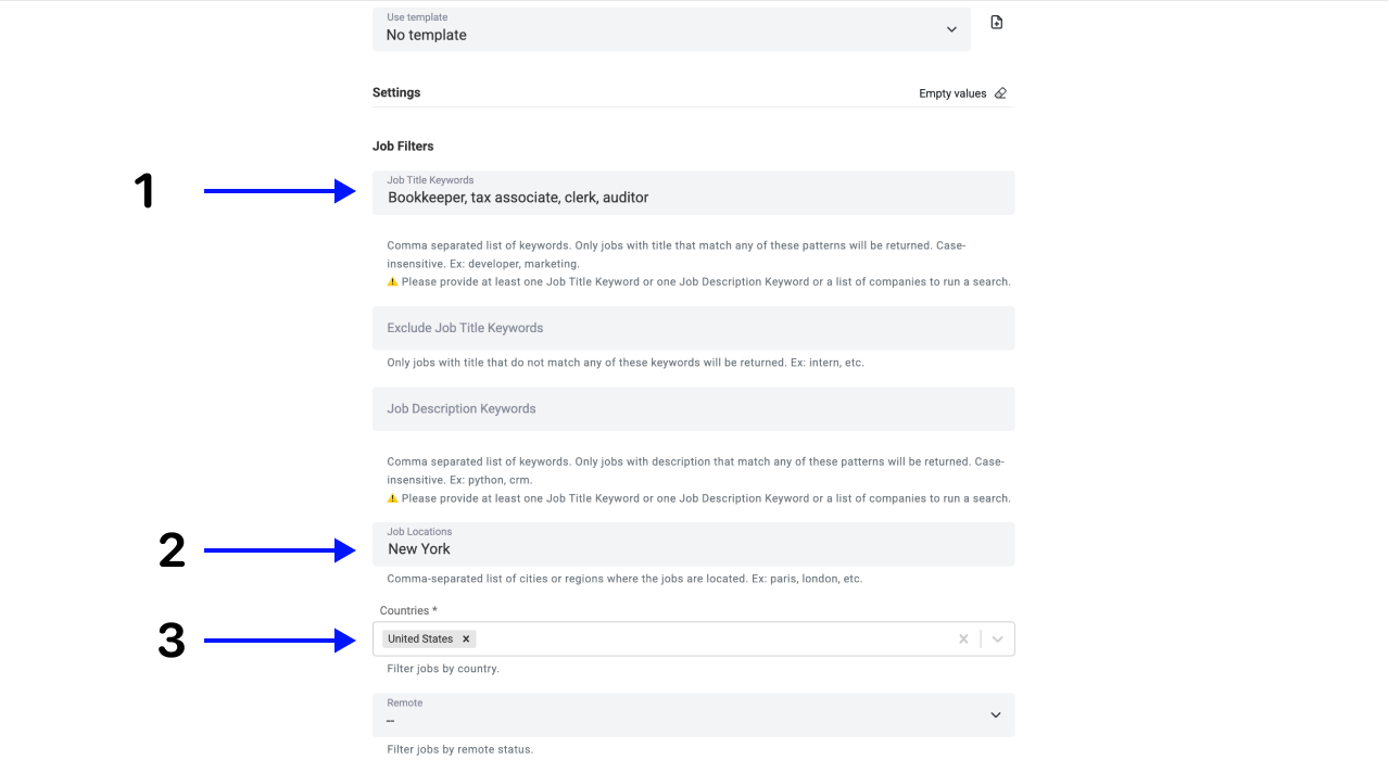 You'll see a filter interface that lets you define exactly what kind of job postings you want to scrape.