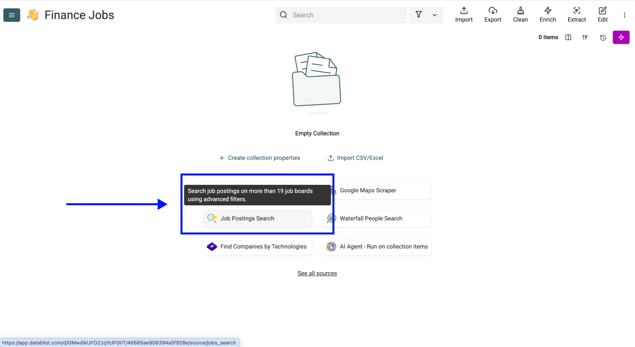 The easiest way to scrape tech jobs in Boston is to use Datablist's job board scraper. Sign up, create a collection, open the Job Postings Search, set your filters to "tech" and "Boston," and click Run. Datablist handles the rest across 19 job boards.