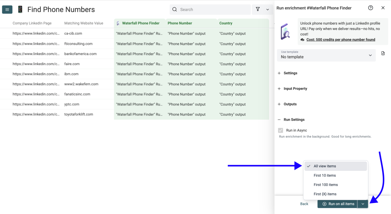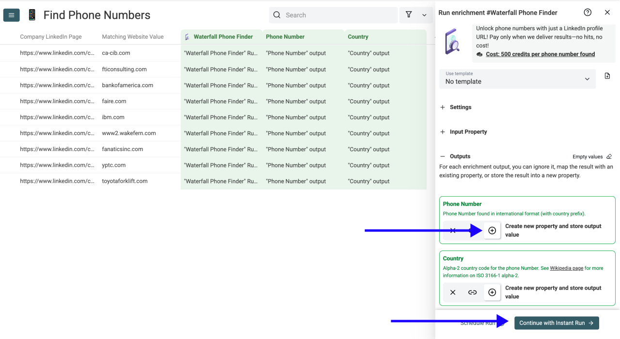 The Waterfall Phone Finder searches across multiple data vendors to find verified mobile phone numbers using LinkedIn profile URLs. It's more accurate but costs more credits (~500 per contact).