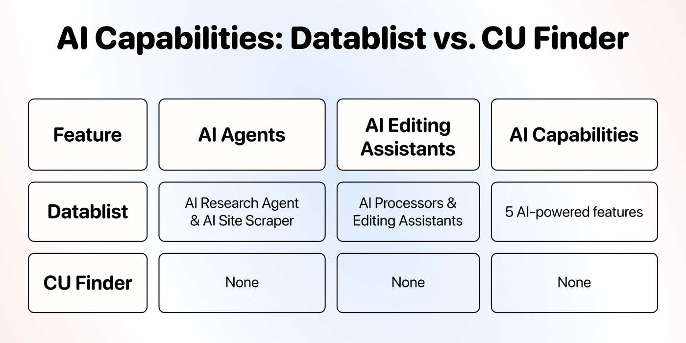 On AI capabilities: Datablist has 3 AI agents and 2 AI assistants. CU Finder has none.