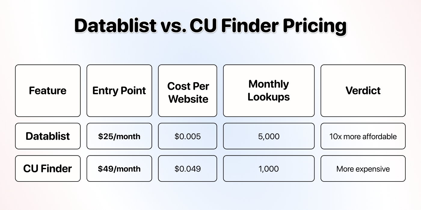 CU Finder's Growth plan starts at $49/month for 1,000 credits[1]. That's almost double Datablist's entry price for significantly fewer lookups.