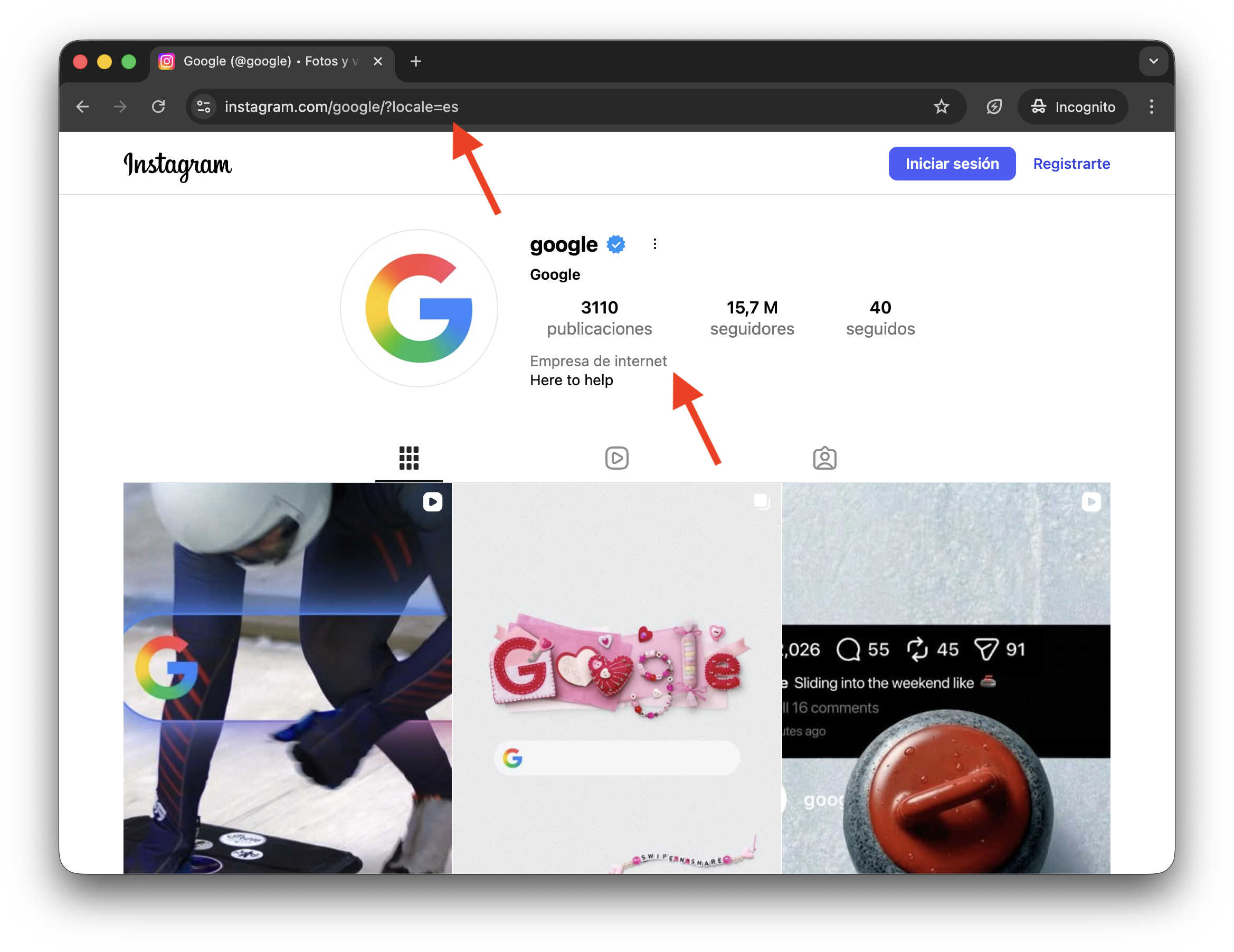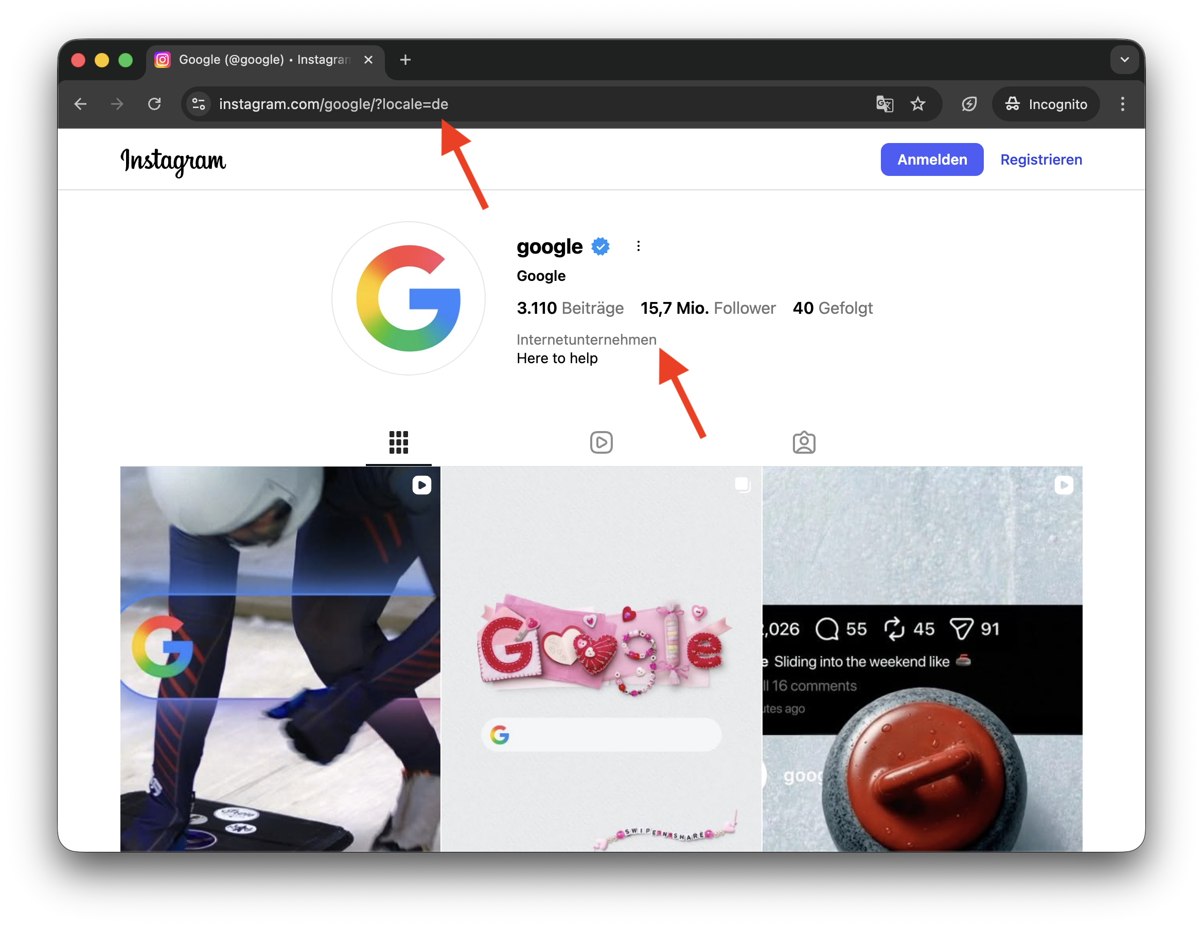 For example, to view the Google Instagram profile as a German user would see it, use this URL: