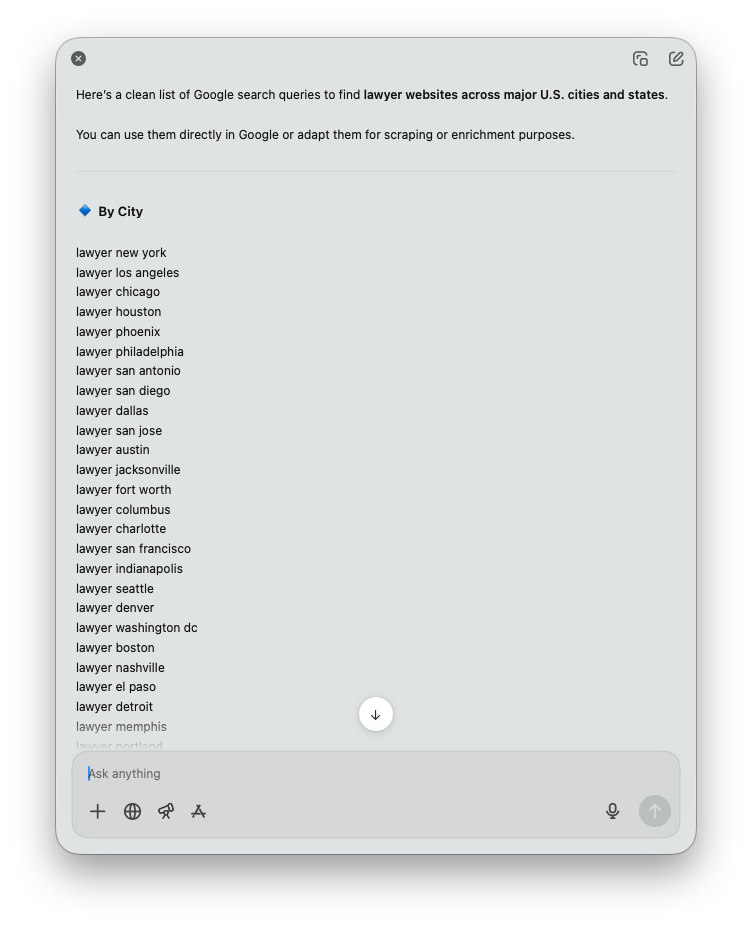 This multi-query strategy is the same principle used for scraping Google Maps effectively, where you search by ZIP code instead of a whole city. By breaking one big problem into hundreds of small ones, you bypass Google's limits and get exponentially more data.