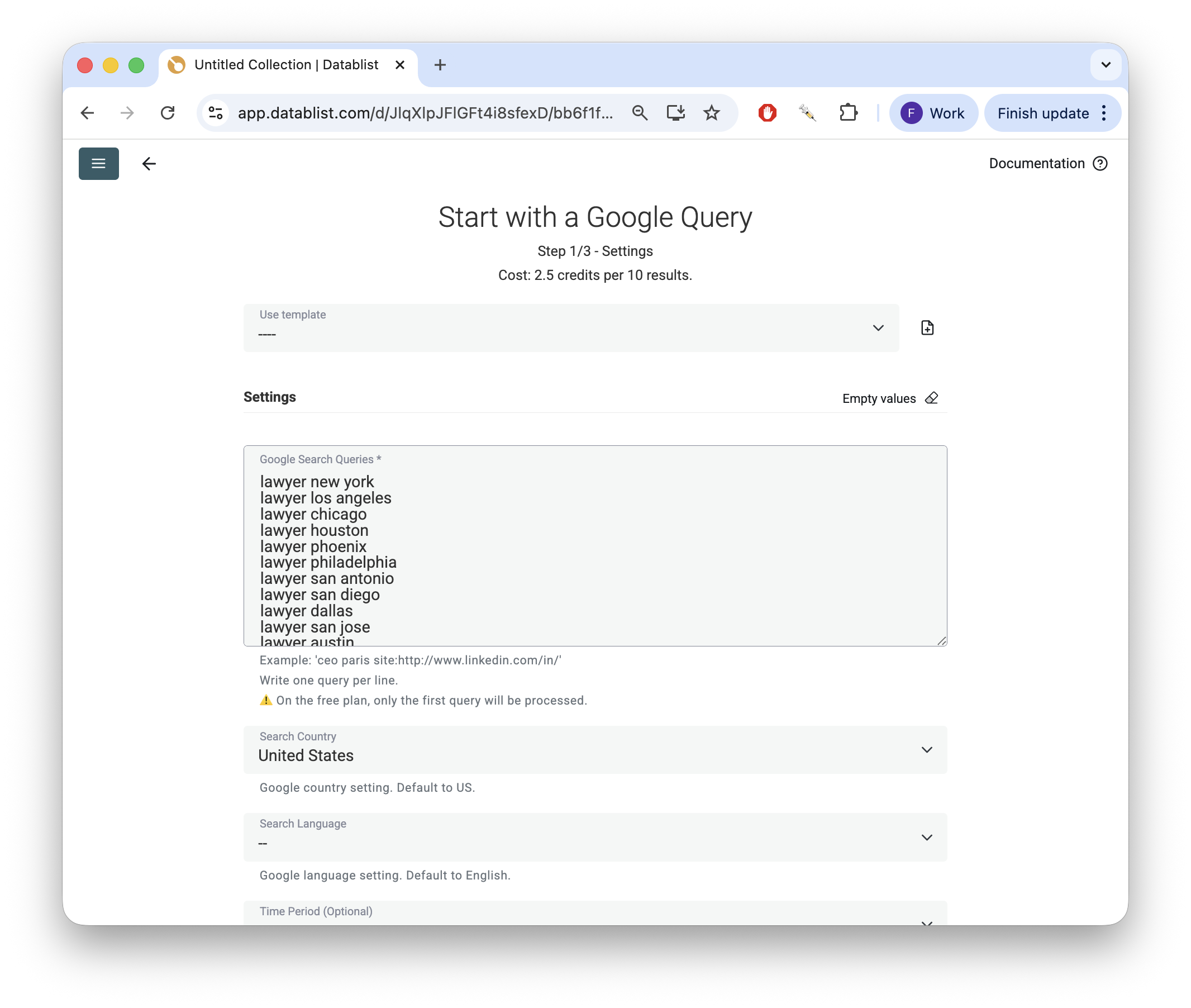 How is this different from a normal Google search? A normal search is manual and stops at 250 results. The Datablist Google Query source automates hundreds of searches at once, bypasses the 250-result limit by using multiple queries, deduplicates the findings, and delivers the data in a clean, structured spreadsheet.